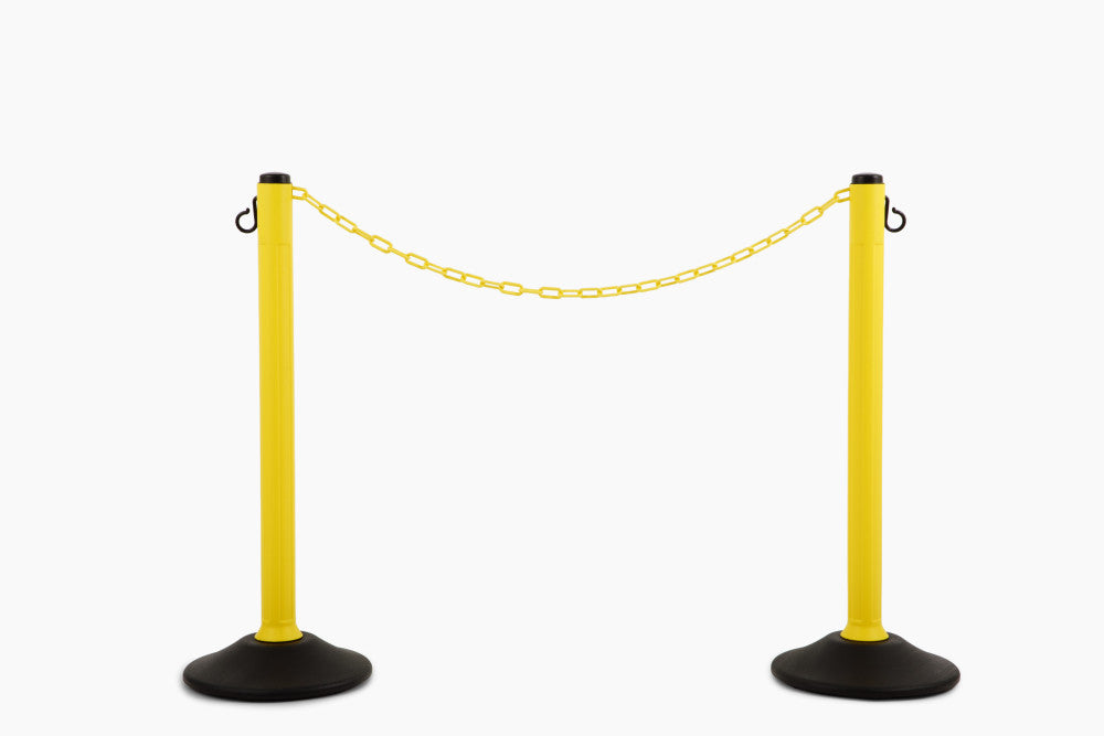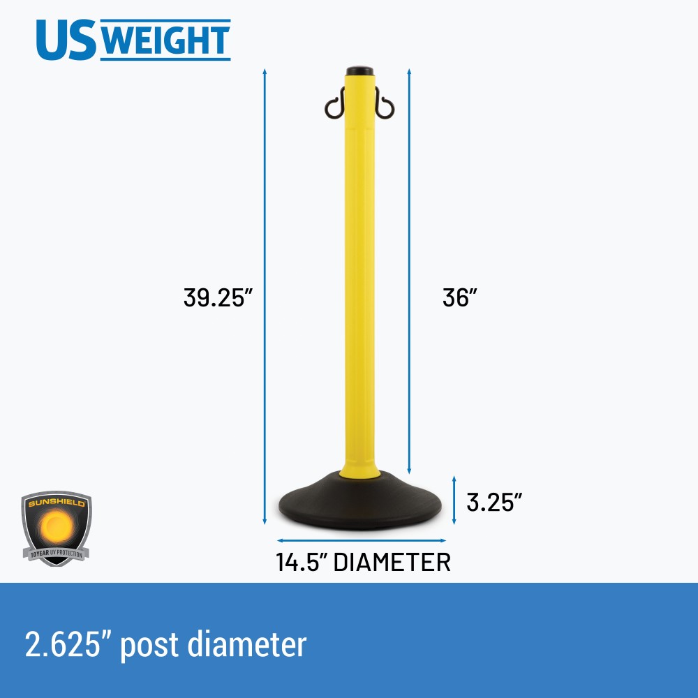 Built to withstand the demands of the toughest environments, the US Weight ChainBoss crowd control stanchion set can be used both indoors and outdoors. Made in the United States, the ChainBoss is equipped with features perfect for safely controlling crowds, directing the flow of foot traffic, or protecting a closed area for construction or cleaning. The ChainBoss features patented Integrated Chain Storage system, so chain is stored inside the post when not in use for incredible portable convenience. Then, easily pull the chain out of the post using the pop-up top which allows for easy chain disbursement. Each 39.25-inch-tall post includes 10 feet of all-weather molded, high-tensile strength 2-inch plastic chain that is fade-resistant. Both the stanchion and the chain feature SunShield, 10-year UV protection. The ChainBoss includes a durable, scratch-resistant high-density polyethylene base that can be user filled with sand or gravel. On the bottom of the base are no-skid, non-marking rubber feet keeping the post in place even during rough use. No tools are required for assembly. The Easy Connect snap together construction between the post and base takes less than 5 seconds and is easy as 1, 2, 3. Choose between combinations of no chain, yellow or black plastic chain, and two or six pack quantities.